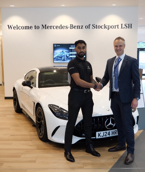 [Abdullah Hussein and LSH bossVaughan Blackman pose together at the group’s Stockport Mercedes site]