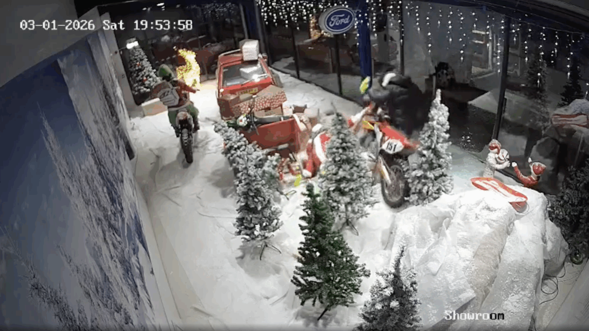 The duo made off with two red Honda scrambler bikes as well as a child’s Mini Moto bike, all of which had been in use in the business’s Christmas window display.