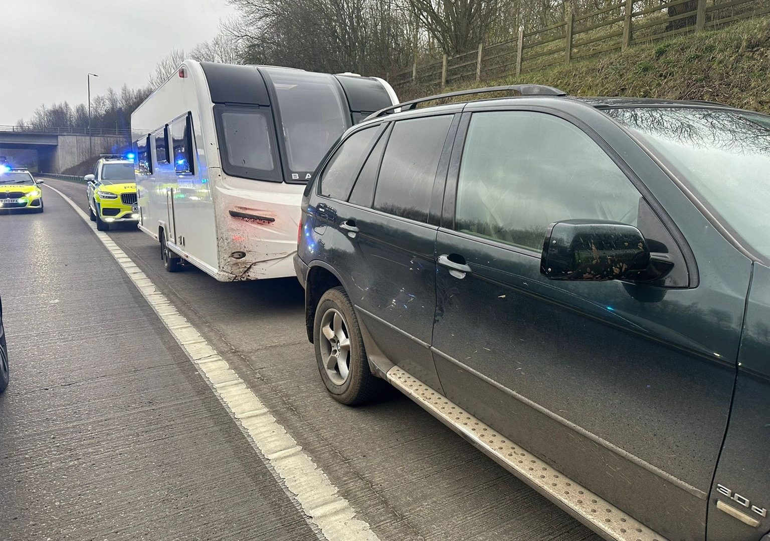 An 11-year-old boy was arrested after being stopped by police at the wheel of a BMW X5 towing a suspected stolen caravan on the M1.
