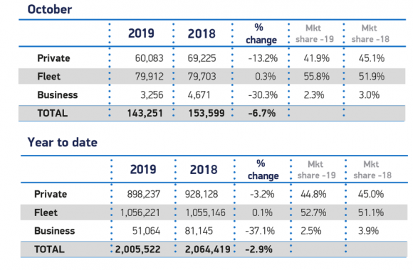 A total of 10,348 fewer cars were registered than in October last year, reflecting a tough environment for businesses and consumers as economic and political uncertainty continued to affect confidence.