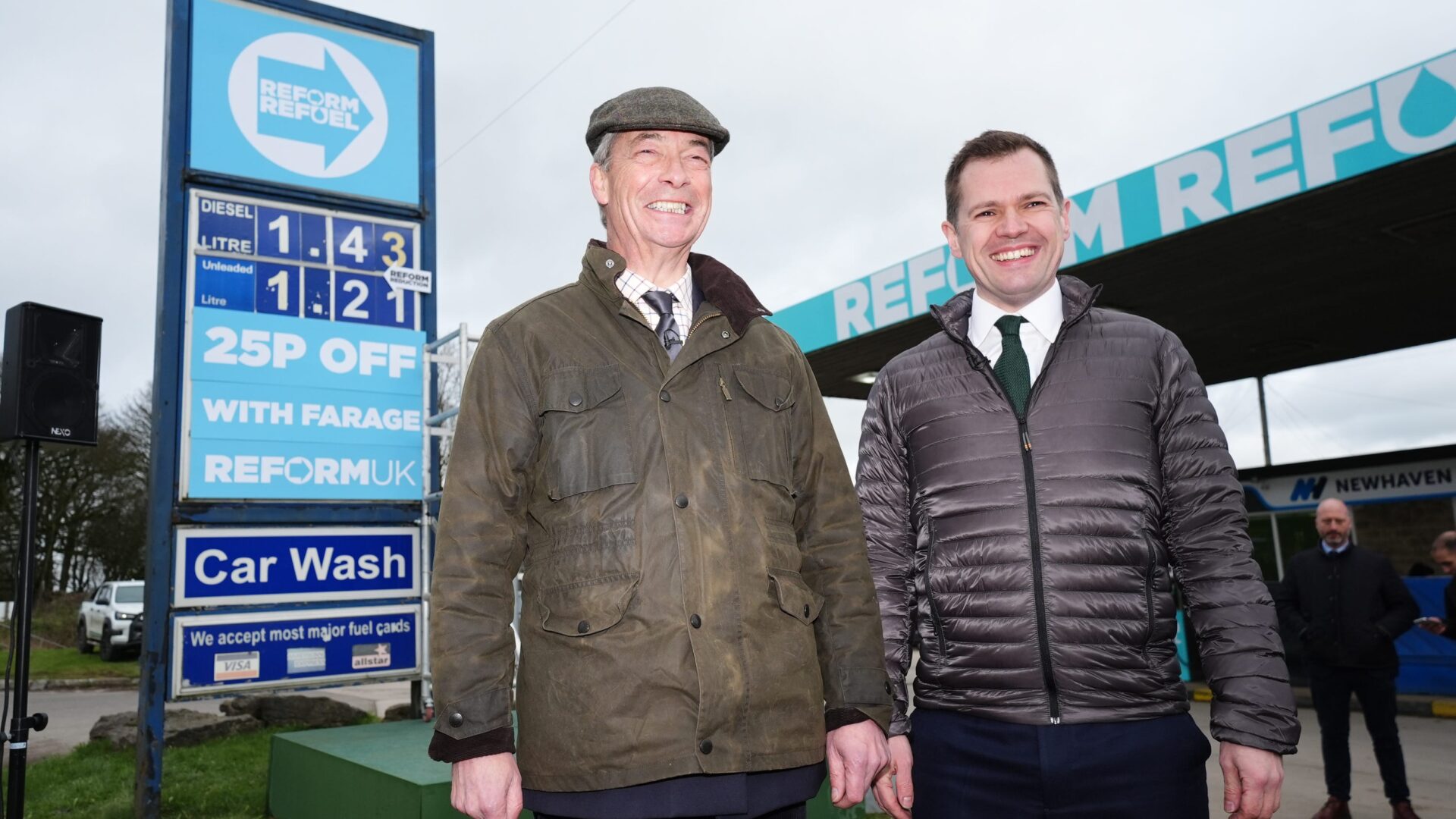 Farage announced the policy at a forecourt in Derbyshire where the price board was covered in the party’s turquoise branding with the lettering ‘Reform Refuel’ and ’25p off with Farage’, putting a litre of diesel at £1.43 and a litre of unleaded at £1.21.